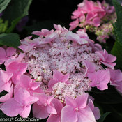 This is a very hardy hygrandea which survived fall pruned to the ground in it's first year by a helpful husband. Large leaves are verdant, lush green. Pink flowers which will rebloom from large flower heads; these do not have a typical full, fluffy hydrangea flower cap, just sprinkles of blooms on the heads all summer into fall.